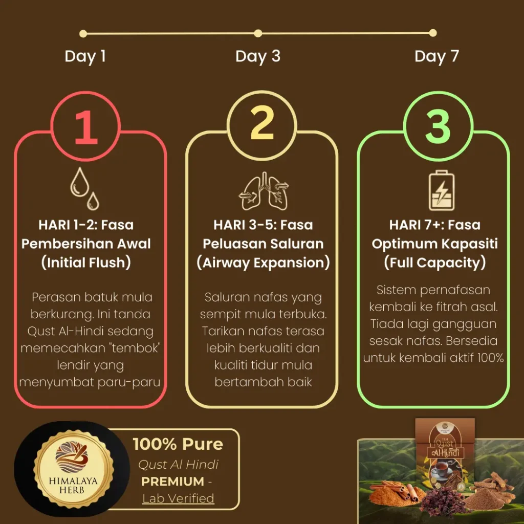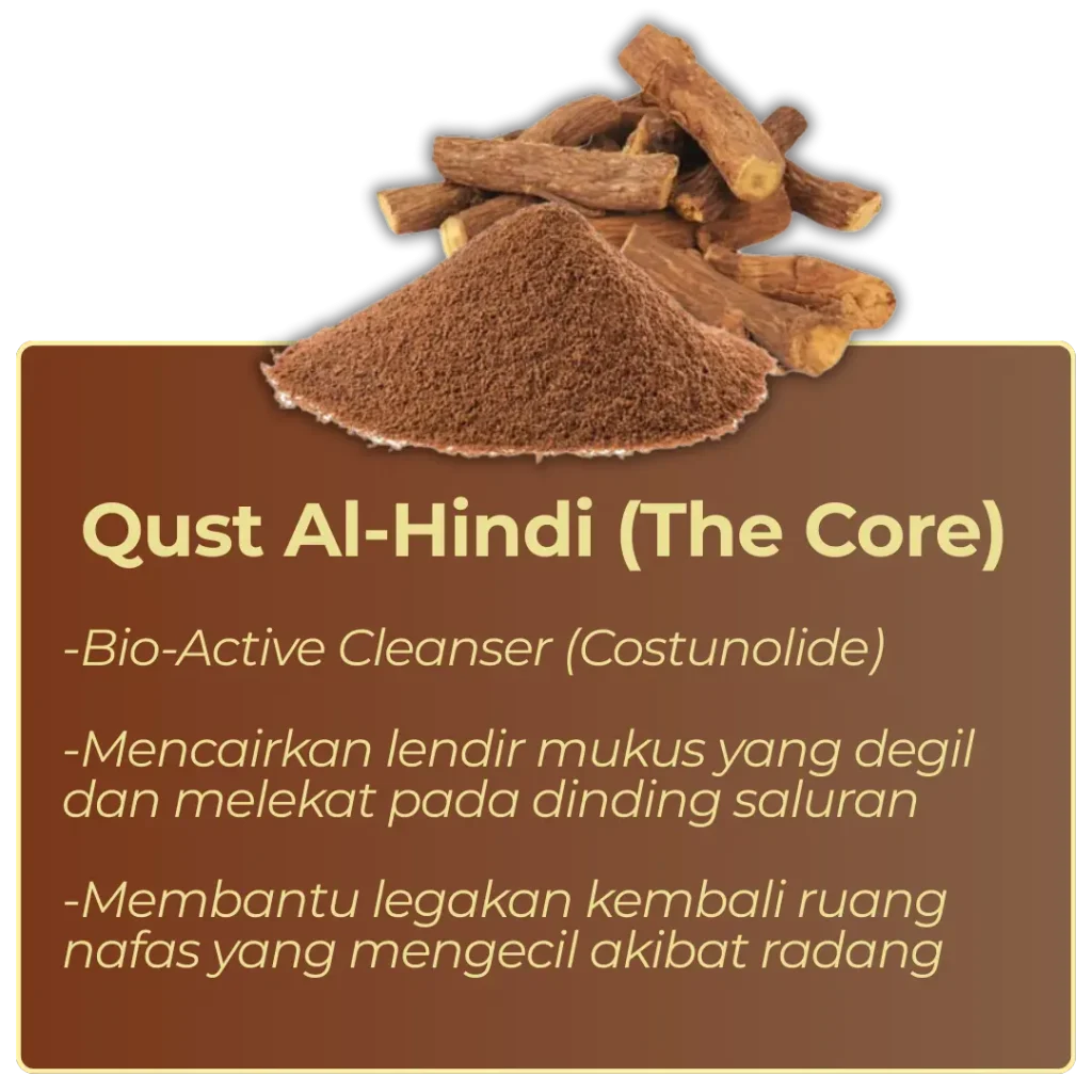 Kandungan aktif dalam Qust Al-Hindi bertindak sebagai biosolvent semulajadi yang membantu melegakan saluran tersebut, menyokong aliran oksigen yang lebih lancar.