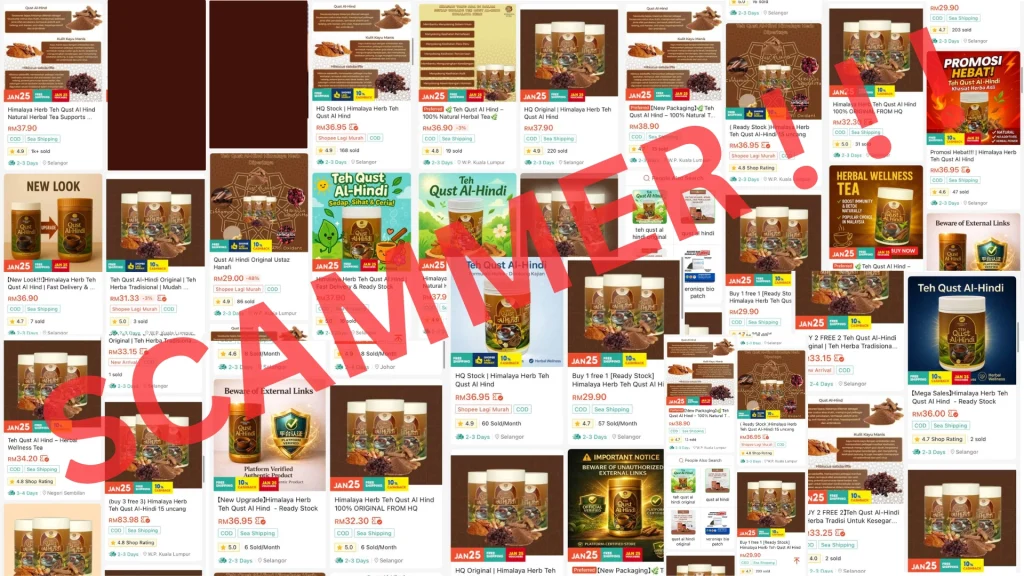 Ini adalah sebahagian kecil daripada beratus-ratus ‘Seller’ yang tidak bertanggungjawab menggunakan imej botol kami untuk menjual produk palsu. Mereka menawarkan harga murah yang tidak masuk akal, tetapi anda perlu tahu kebenarannya:
